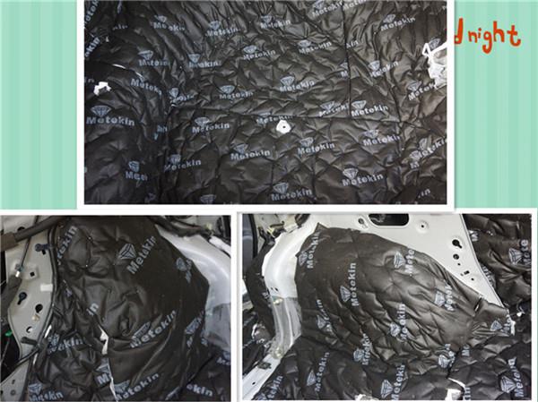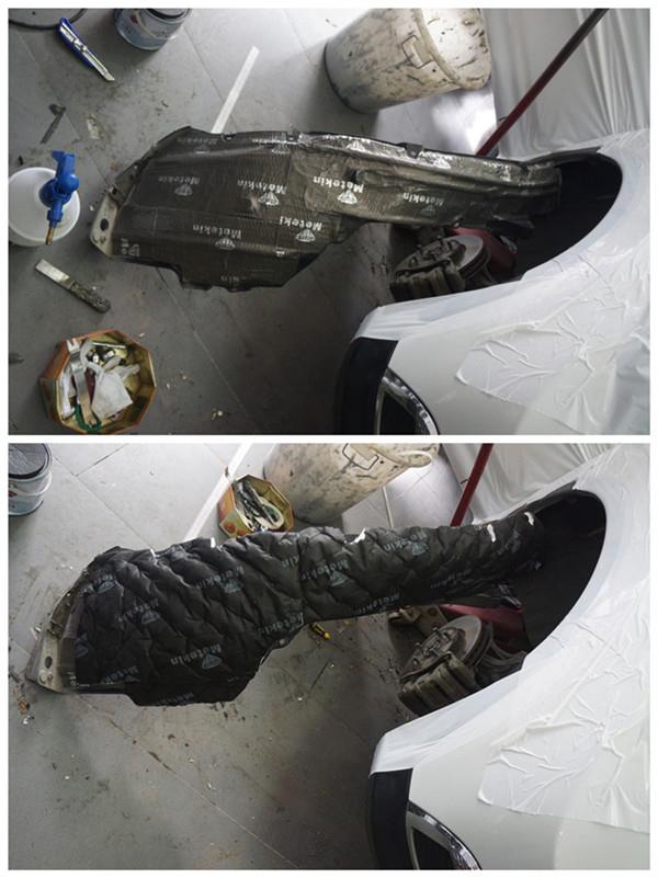 轮胎与路面及碎石与钣金件所生成的摩擦及撞击杂音通过前后轮弧及翼子板的震动很轻松的就传入到驾驶舱。这些部位减震吸音施工后对降低因路面与避震器所引起的噪音,效果是很明显的。翼子板为美特静减震板+美特静吸音棉,双重隔音效果更出色。