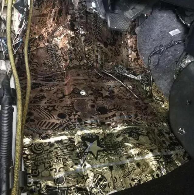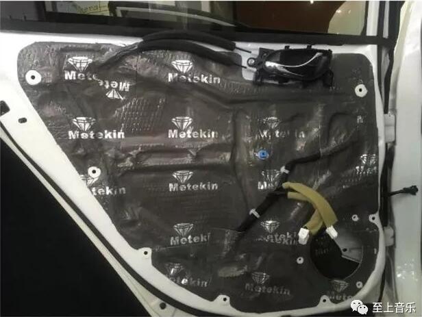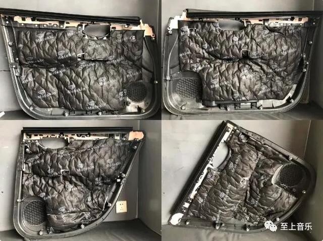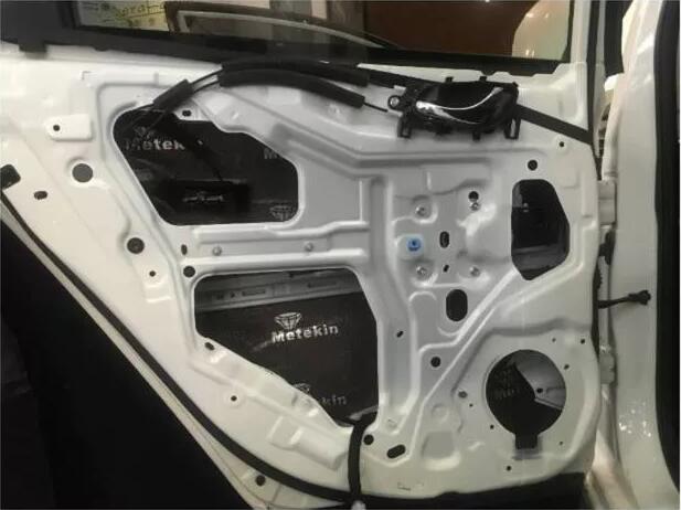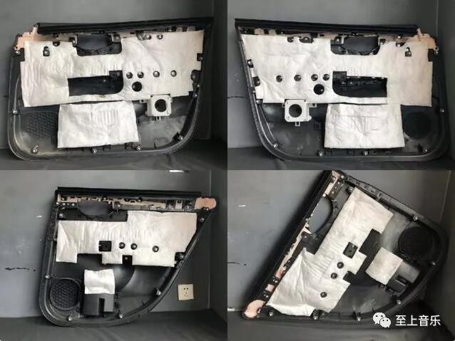 四门车门贴得工整,美观是必须的,在车门板上铺上一层美特静吸音棉,这个是吸收噪音的主要功臣和隔热性能,具有良好的回弹性,耐摩擦,及抗老化性极强。