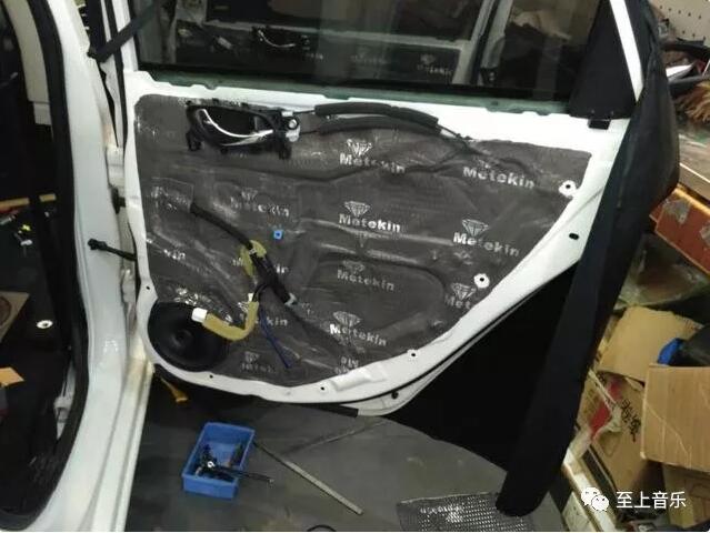 针对门板,车门进行双层隔音,车门是风噪向驾驶室内传递的主要途径,师傅们特别使用抗震板对车门里外两层钣金进行双层减震、密封和隔音处理,全方位提升车门对噪音的防御能力,抑止风燥的传入和共振,并把门板密封。