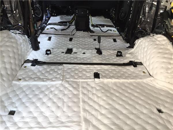 地板采用美特静白雪莎吸音棉覆盖强化隔音效果,美特静白雪莎吸音棉比重极低,且吸音隔热效果非常优异,即使大量在车内使用,也不会增加过多的重量。