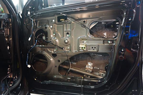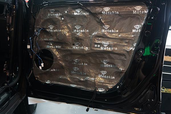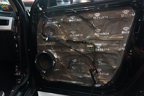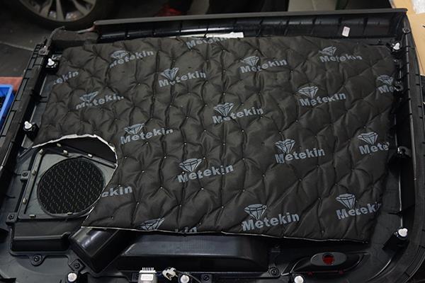 为了给汽车音响喇叭打造一个良好的工作环境,改装技师采用美特静隔音材料对车门做了双层的隔音处理,这就像是在门板的周围制作了一个箱体一般,一方面能够减少噪声对其的干扰,另外一方面还能够有效的增加音乐的立体感。
