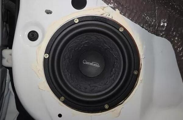 下图为套装喇叭的中低音安装在门板上的特写,这样既美观,又可以达到更佳的效果。