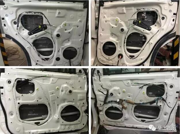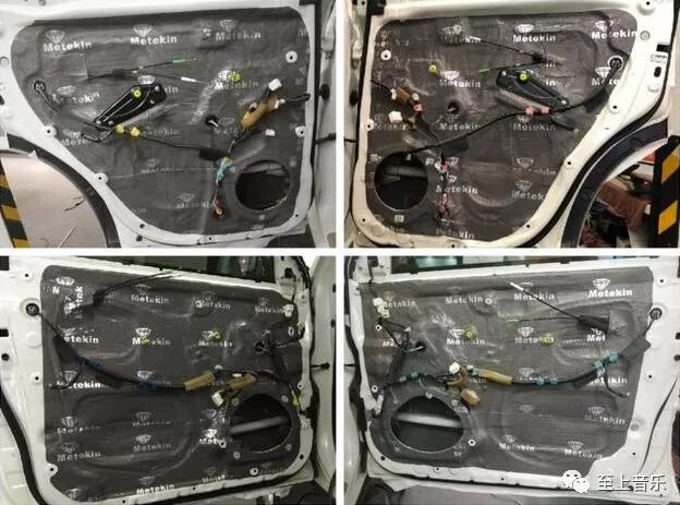 四门隔音使用美特静减震板,先在车门里贴一层减震板,里层隔音做好后。