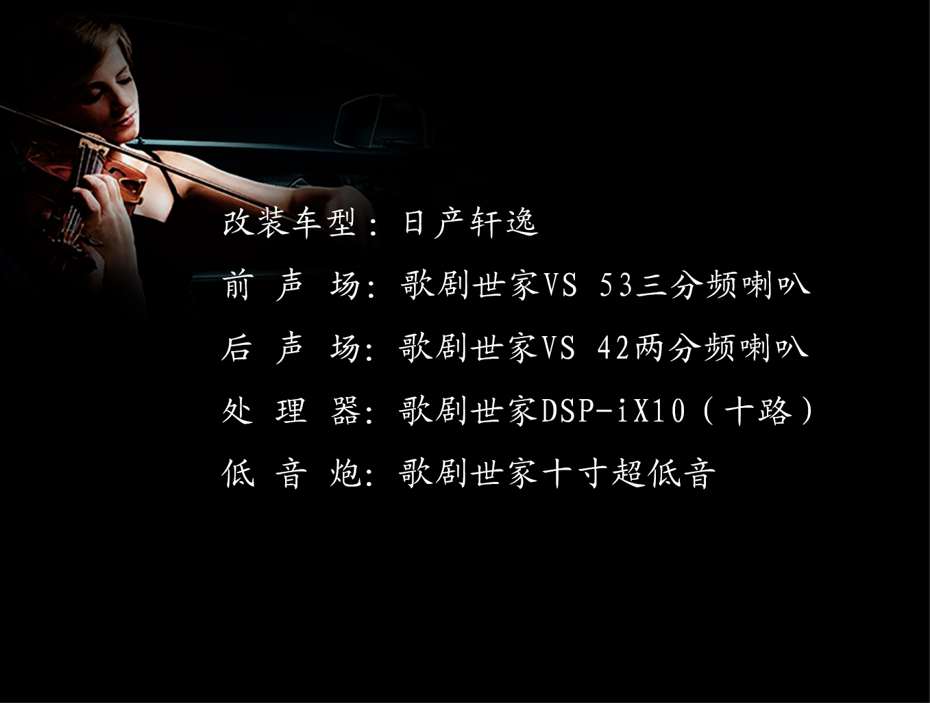在器材的搭配和选择上,日产轩逸车主选择一台歌剧世家DSP-IX10十路处理器功放加持,强大的功能和处理能力让声音更加优质精美,前声场是一套歌剧世家VS 53十五周年纪念版三分频套装喇叭,中、高音倒模A柱,中低音车门原位安装,常规的安装手法,校准位置后为驾驶位获取合适的听音体验;后声场一套歌剧世家VS 42两分频喇叭,为后排乘客也能提供一个好的听音环境;还有一个歌剧世家低音喇叭补充低频的不足,提升低音下潜力度。