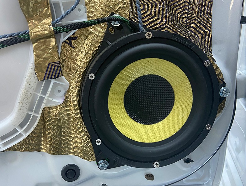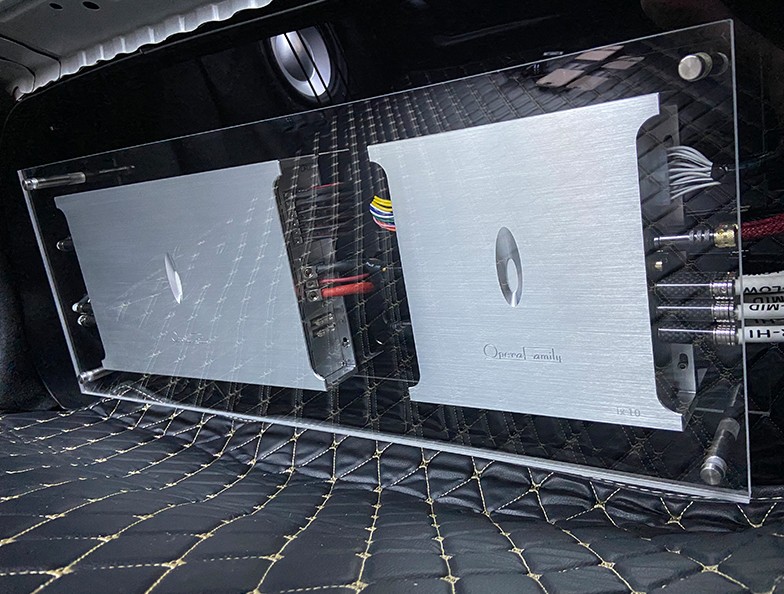 凯美瑞采用原车主机搭配一台歌剧世家DSP-iX10处理器组成前级,用强大的声音解析力为整体声场打下坚实的基础。前声场安装一套迈博特神话三分频喇叭,高音单元安装于三角位,中音单元安装在仪表台上,这样可以为驾驶位获取非常好的聆听体验,中低音单元原位安装在车门板,三频之间相互呼应衔接,在一台歌剧世家VA 66六路功放的推动下,做主动分频设计,让三分频出来不错的音质。